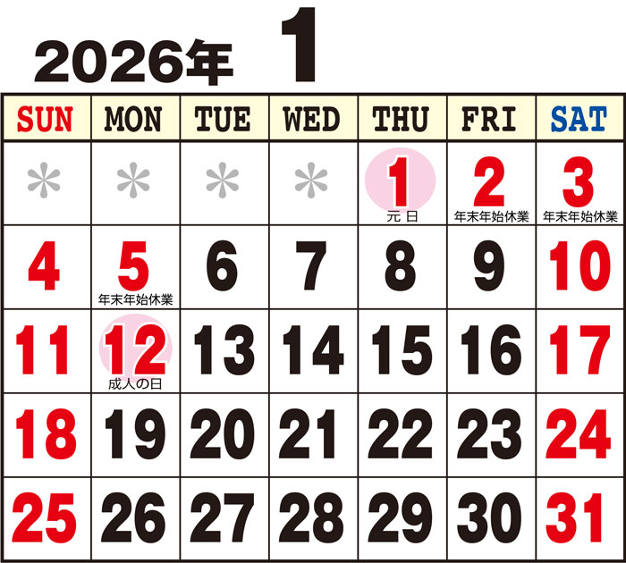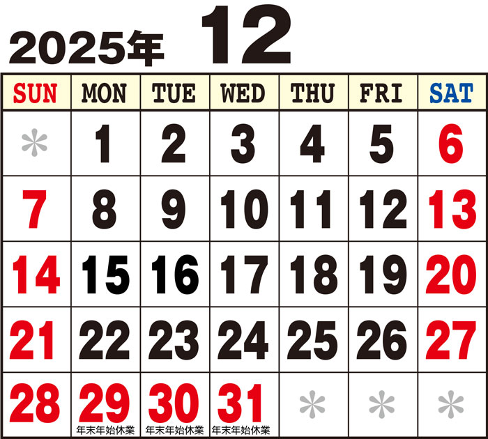 年末年始は長期間お休みさせていただきます。お客様各位には大変ご迷惑をおかけいたしますが、悪しからずご了承ください。